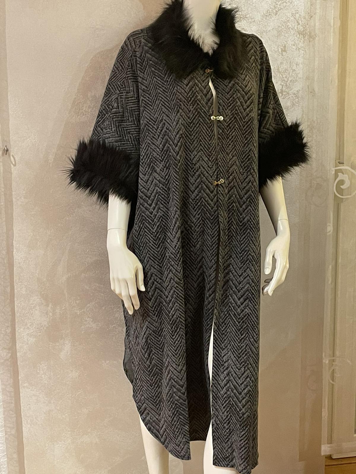 Pončo za pomladne dni. Je elegantno ogrinjalo, ki naredi ženski posebno linijo. Kombinira se lahko k različnim hlačam tako malo bolj izjemnega sloga kot tudi za kombinacijo s kavbojkami. Ima ovratnik v imitaciji krzna, ki daje oblačilu bolj resen videz. Pončo se zapre s posebnimi pozlačenimi zaponkami, da se lahko nosi zaprt ali pa tudi odprt, kakor ženski ustreza. K ponču lahko iz kolekcije kombinirate tudi primerno torbico in se tako izgled ženske dopolni.