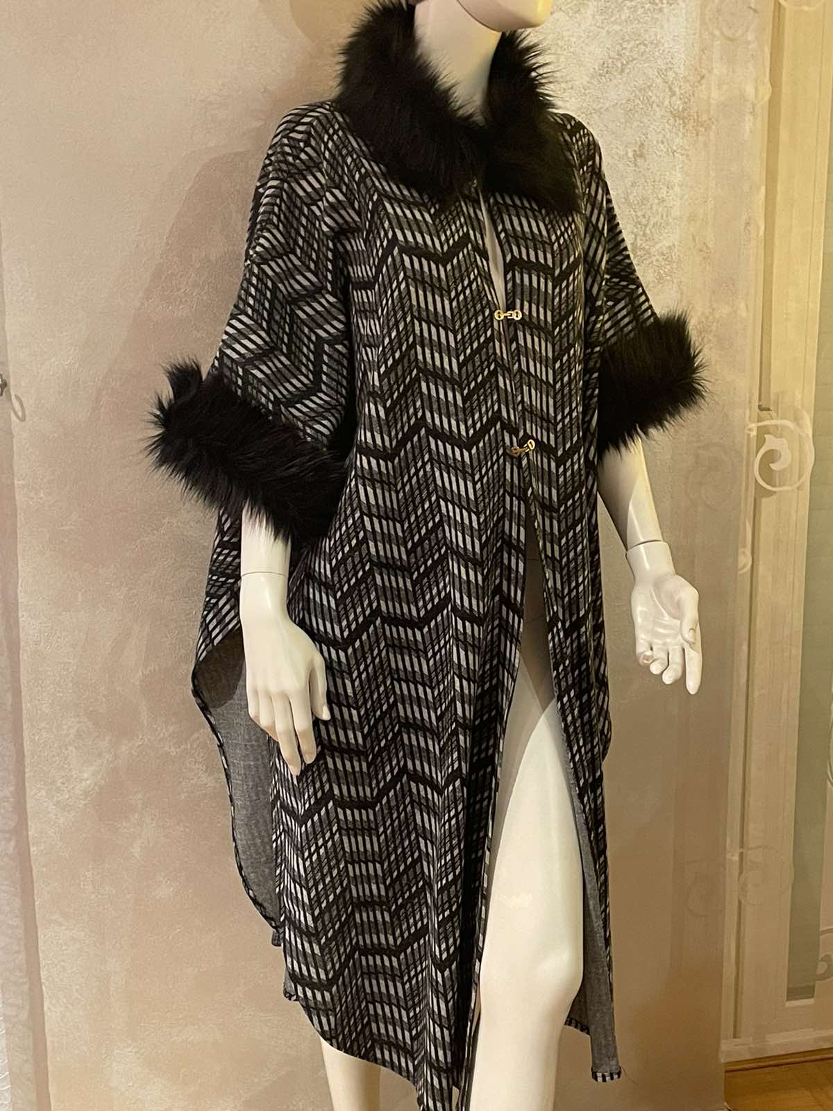 Pončo za pomladne dni. Je elegantno ogrinjalo, ki naredi ženski posebno linijo. Kombinira se lahko k različnim hlačam tako malo bolj izjemnega sloga kot tudi za kombinacijo s kavbojkami. Ima ovratnik v imitaciji krzna, ki daje oblačilu bolj resen videz. Pončo se zapre s posebnimi pozlačenimi zaponkami, da se lahko nosi zaprt ali pa tudi odprt, kakor ženski ustreza. K ponču lahko iz kolekcije kombinirate tudi primerno torbico in se tako izgled ženske dopolni.