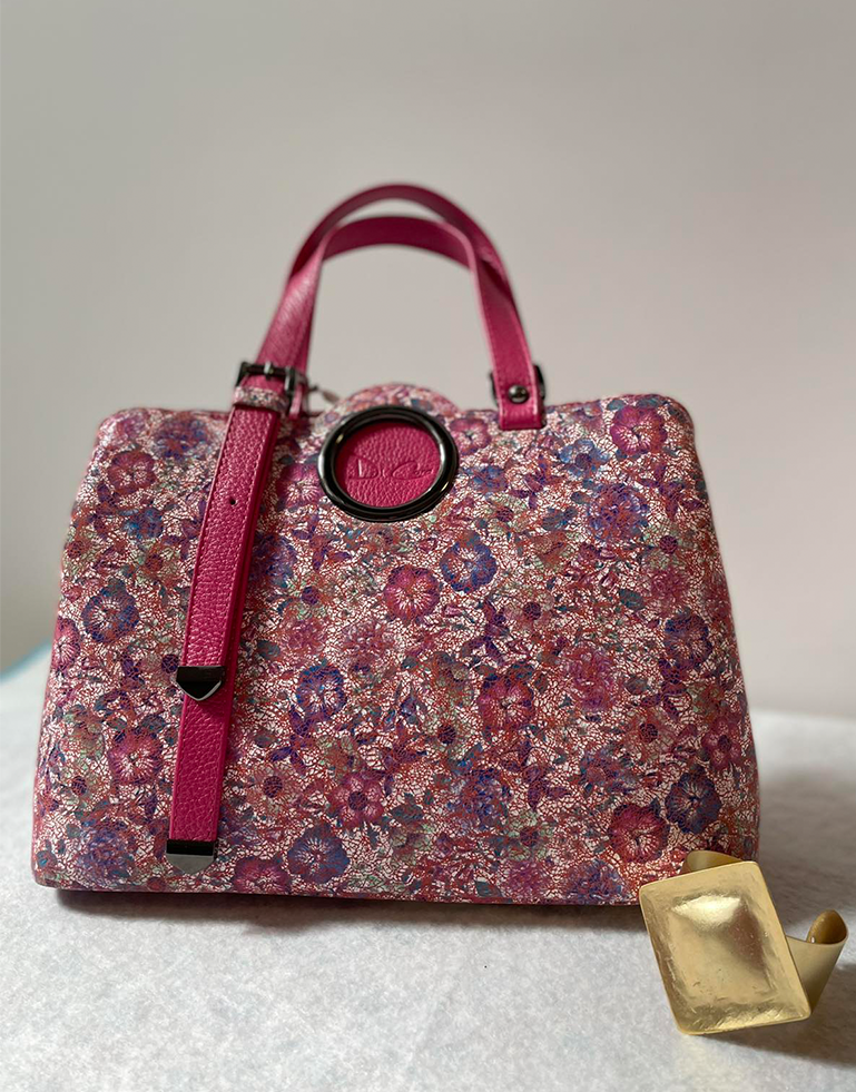 Elegantna torbica s cvetlično poslikavo v vijoličnih odtenkih; krogec med ročkami popestri izgled torbice